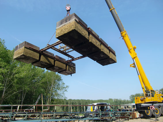 Abbau Schwimmbänder und Greiferbagger, Transport an neuen Standort
